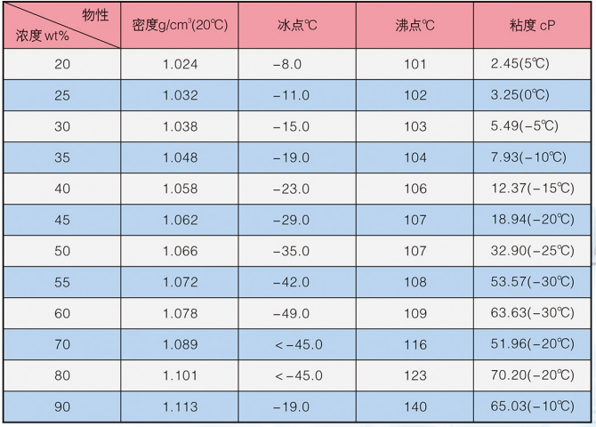 LM-4系列冰河冷媒由二元醇改性構(gòu)成,主要添加劑包括防腐蝕劑,防霉劑,增溶劑,水穩(wěn)劑等。外觀為淺色液體。安全低毒、無異味、不易燃、不易揮發(fā)。20℃時,原液密度為1.105~1.125g/cm',粘度為13.92mPa·s(cP),比熱為0.619cal/g℃,熱導(dǎo)率為0.26W/mK。沸點高于140℃,閃點高于120℃。